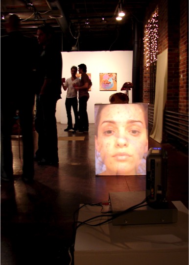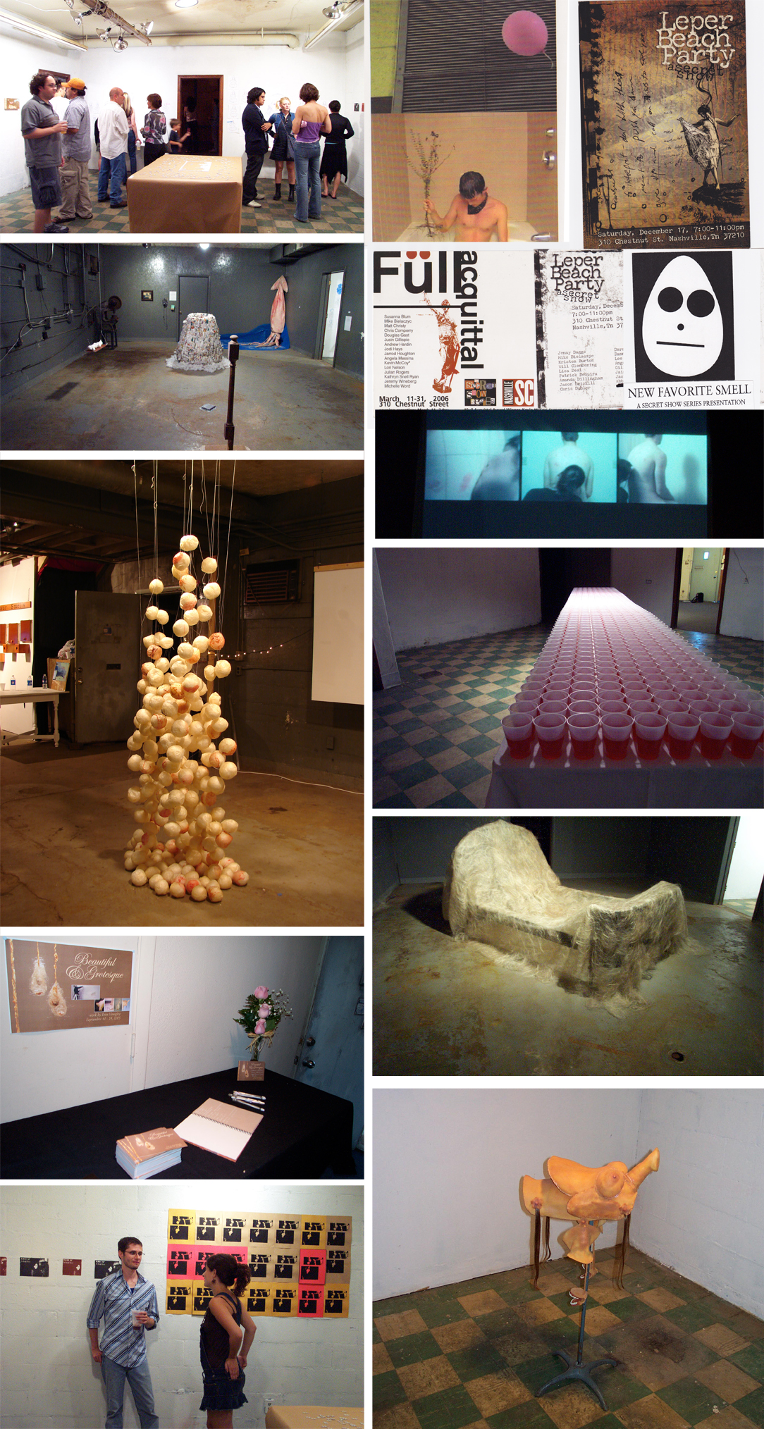 Bottom left: Secret Show founders Jason Driskill and Amanda Dillingham. Featured work by Erin Hewgley (bed made of hair and saddle made of female anatomy), Barbara Yontz and Casey Yorkunas (sculpture mounted from ceiling with sound piece), Jacqueline Meeks (video of hickeys on back), Ryan Lewis (cups of kool aid referencing Jonestown Massacre)