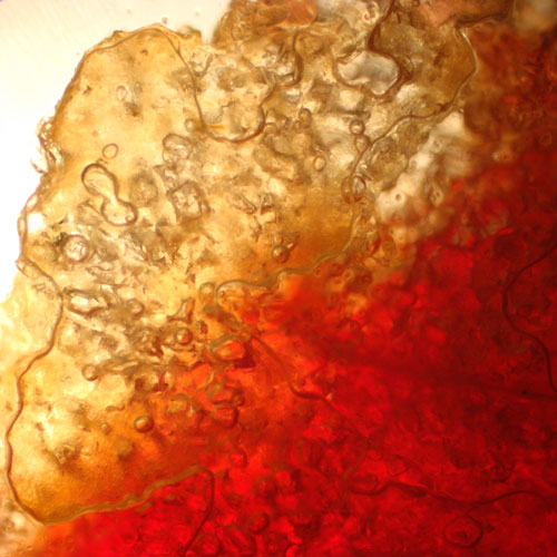 I am attracted to images of fruit juice for their color and vibrancy. Cranberry juice viewed at 40x is bubbly and amorphous like a lava lamp. The pictures are viscous and textured landscapes, atmospheres of strange planets.