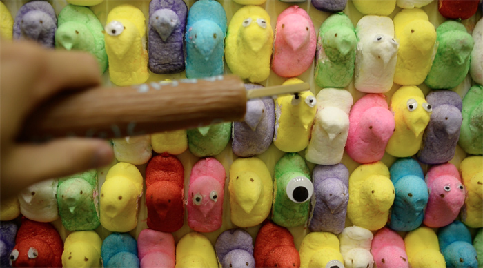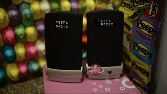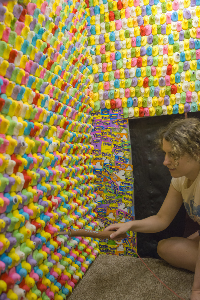 We glued magnetic googly eyes to many of the individual Peeps for the viewer to interact with, using a magnetic "magic wand."